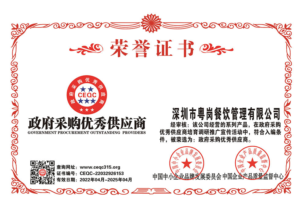 深圳市粵崗餐飲管理有限公司,是一家集蔬菜種植和農副產品配送為一體的專業型餐飲公司,主要為學校、工廠企事業機關單位提供蔬菜和農副產品配送服務。公司自成立以來始終以質優價廉、服務至上為原則,嚴格按照ISO:9001國際標準體系進行管理。同時建立了行業領先的配送中心、大型冷庫和保鮮庫、檢測中心以及專業化的配送團隊,能長期安全、穩定、準時的配送貨物。我們所有蔬菜均經過初步加工、無黃葉,無泥沙等雜質,利用率達97%以上...保障向用戶提供的各類食材的衛生和質量。公司為了適應不同客戶的需求,配有專業人員和配送車輛,實行“一對一”的服務體制,一心一意的為客戶服務,秉承粵崗誠實守信、服務第一、客戶至上的服務標準,真正讓客戶花最少的錢吃最好的菜?;泹彾嗄陙砗我孕佬老驑s,因為我們知道只有勇于擔當責任,才能承擔更大的責任,就是因為 粵崗員工貫徹公司態度決定一切、細節決定成敗的真理,從質量抓起,從服務做起,才創造了如今的規?;?、統一性配送、專業化服務的粵崗。
